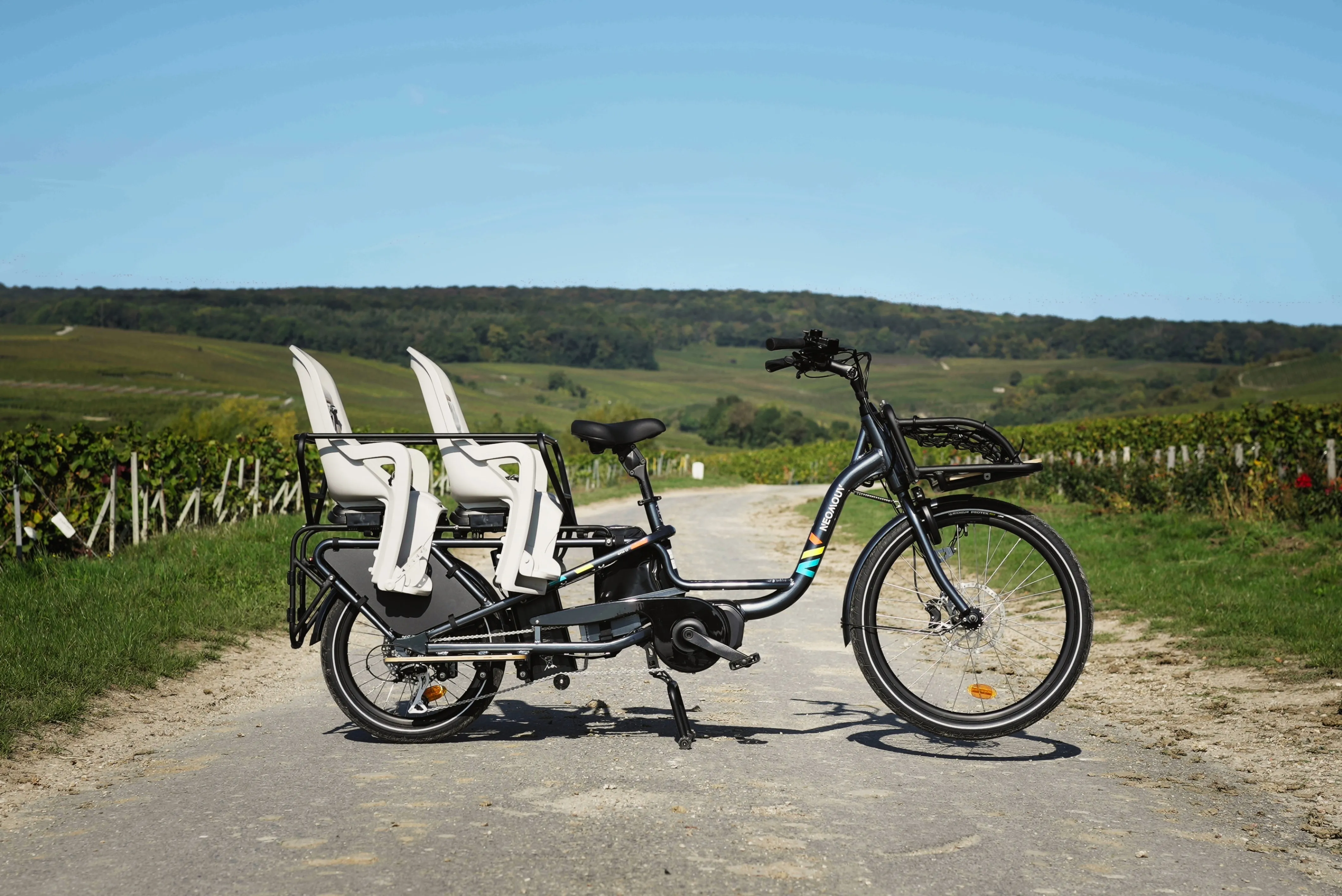 Perfect for exploring the vineyards and villages of Champagne, it boasts a powerful motor and 7 gears ensuring a smooth ride. You can carry up to 60kg at the rear and 30kg at the front. Great for carrying kids and boxes of champagne.